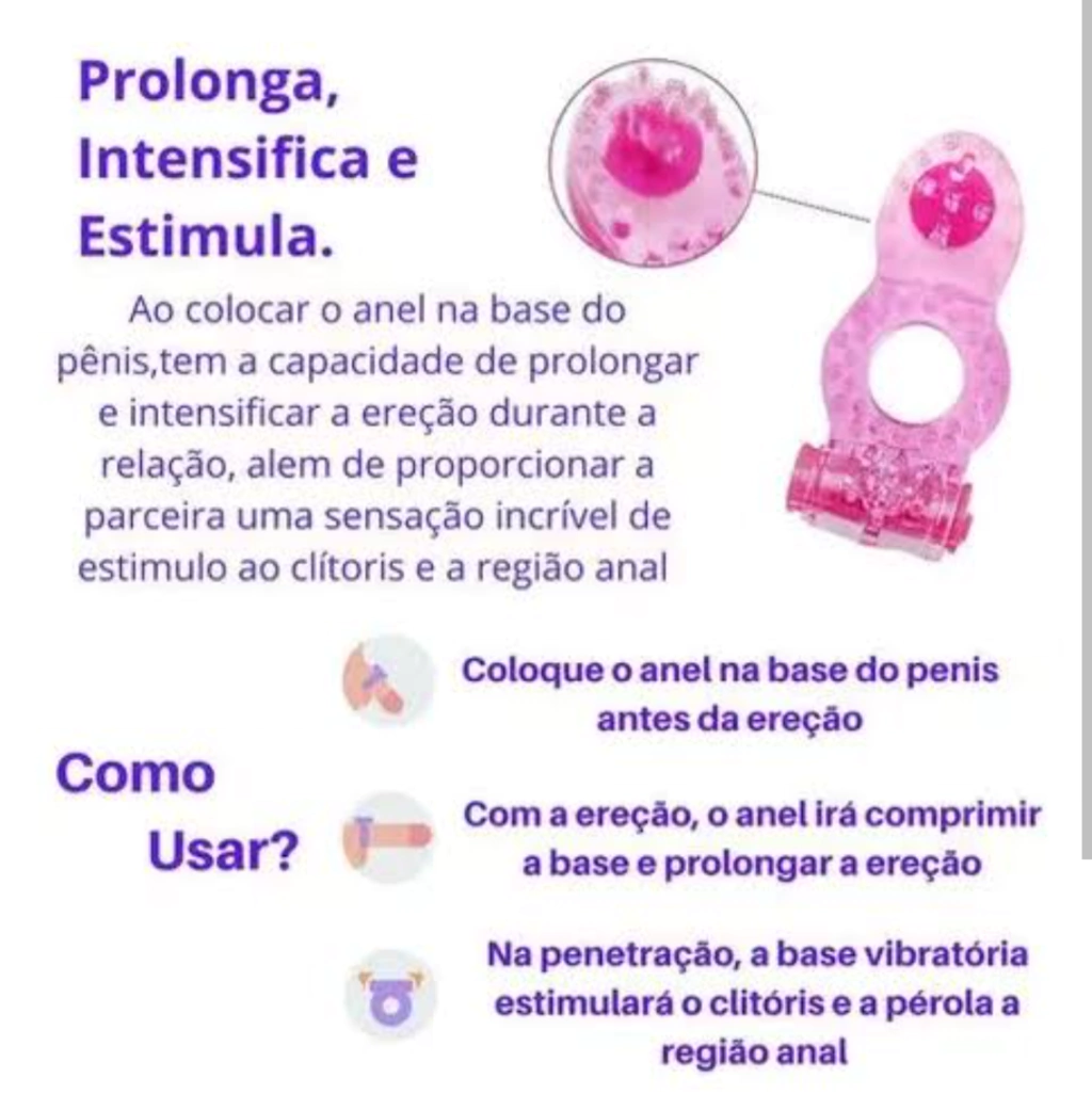 Anel peniano com vibrador e pérola estimuladora, feito em gel super macio com cápsula vibratória. Ajuda a manter a ereção, retardar a ejaculação e também permite uma total estimulação do clitóris da mulher durante a relação sexual, contribuindo para atingir o orgasmo facilmente ao mesmo tempo em que estimula o homem. Combinação perfeita para proporcionar intensos orgasmos.